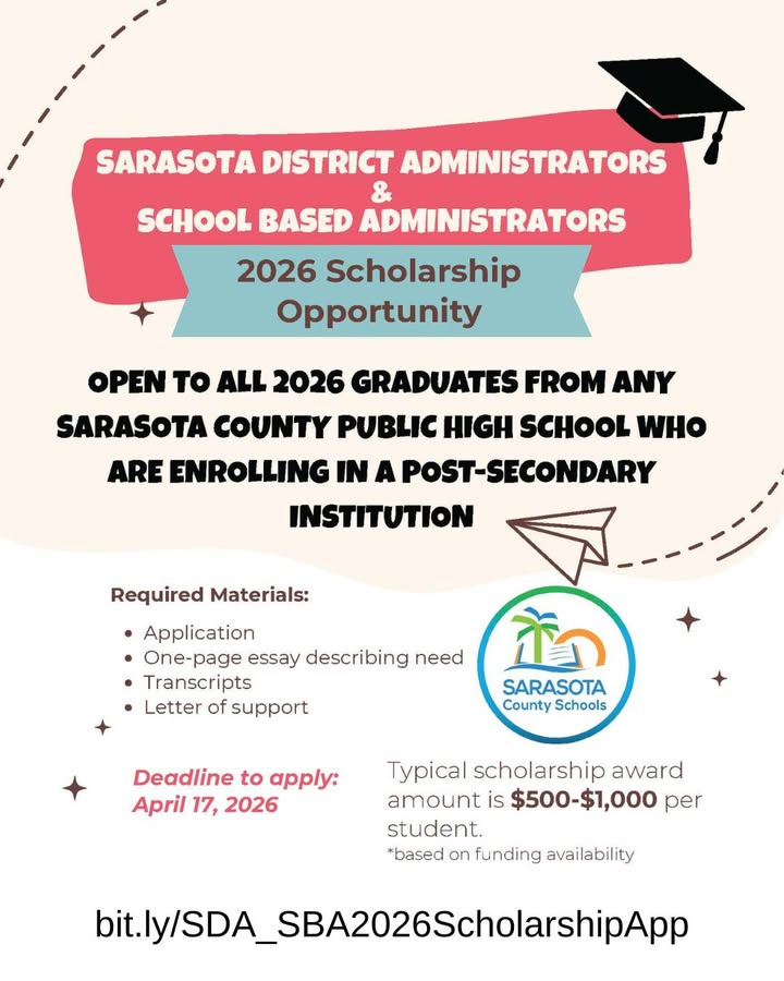 The scholarship is available to all 2026 graduates from any Sarasota County Public High School who plan to enroll in a postsecondary institution.